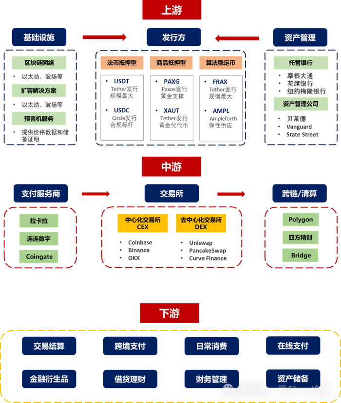 区块链技术是稳定币产业链的“基础设施”:上游厂商如同搭建基建的工程队,凭借区块链底层技术、加密技术和安全方案,为稳定币的发行与交易提供“技术支持”。