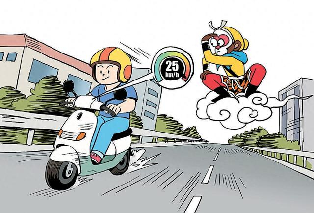 部分电动自行车明显已超速,仪表盘却仍显示25公里/小时。 漫画/琚理