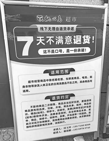 7月15日下午5时许,汉中市桃心岛超市五一路店入口处,一块“线下无理由退货承诺”宣传牌吸引了记者的目光。宣传牌上适用范围栏里承诺:超市经营商品中除名烟名酒、生鲜类商品、电池、贴身衣物等涉及人体卫生的日用消费品不在无理由退货之列,其余商品均适用。该店客服中心柜台上张贴的“线下购物同城通退服务承诺书”公示:本承诺适用于在本店线下各个门店购买的商品(特殊商品除外)。