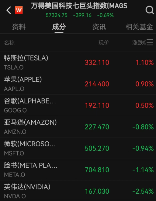 万得美国科技七巨头指数跌0.69%。成分股中,英伟达跌超2%,单日市值蒸发1061.4亿美元(折合人民币约7615.64亿元),MATE跌逾1%,特斯拉涨超1%。
