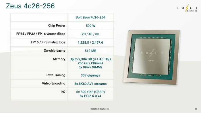 关于Zeus这三款产品,最令人瞩目的无疑是它们的内存架构。传统GPU习惯用 GDDR,为带宽牺牲容量。而Bolt选择 LPDDR5X(带宽) + DDR5(容量),后续还要支持堆栈 SRAM、共封装光学芯片。一个 Zeus 4c 卡的总内存将直逼 2.25TB,远超消费级显卡。这不仅有利于路径追踪数据集场景,且对 HPC 数据集非常友好。