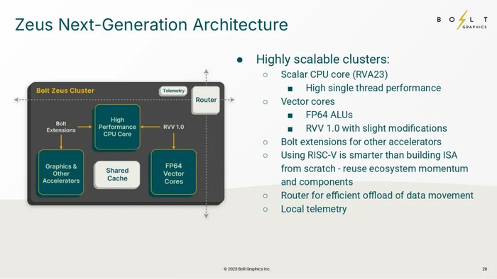 目前Bolt主要可能会在三个方向进行发展:专业工作站市场,对FP64、单精度算力和图形精度都有要求,Bolt 可以与英伟达 RTX A6000、Blackwell 工作站版竞争;在数据中心租赁市场:4c Zeus 配上 800G 网络和 180TB 内存集群,可用于渲染农场、数字孪生平台、雷达仿真等;而在消费级游戏市场,如果Bolt未来推出低功耗单芯片卡,也有可能配合 DirectX/Vulkan 而进入游戏市场。