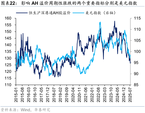考虑到目前仅是美元走弱周期的开始,华泰宏观组估计美元被高估15-20%,对应DXY美元指数的均衡水平为79-83(《美元的衰落:空间及路径》,2025.6.3),中长期AH溢价还有进一步下行空间。