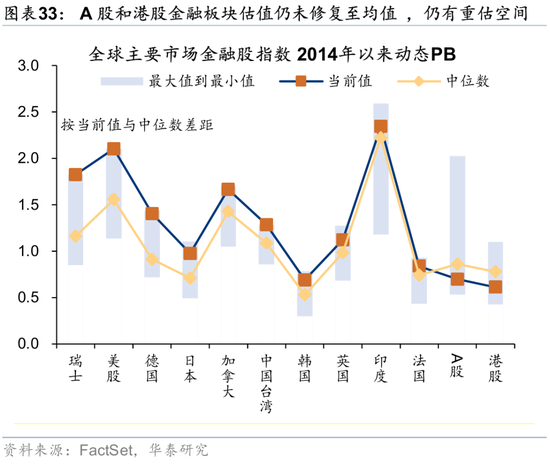 在美元走弱的中期趋势下,全球金融条件转松,利好大金融板块。当前全球主要股市中,金融行业指数动态PB大多都达到2014年以来中位数水平,瑞士、美国、德国、中国台湾等甚至已经接近10年来最高水平。但中国A股和港股金融板块估值仍未修复至历史均值,仍有重估空间。