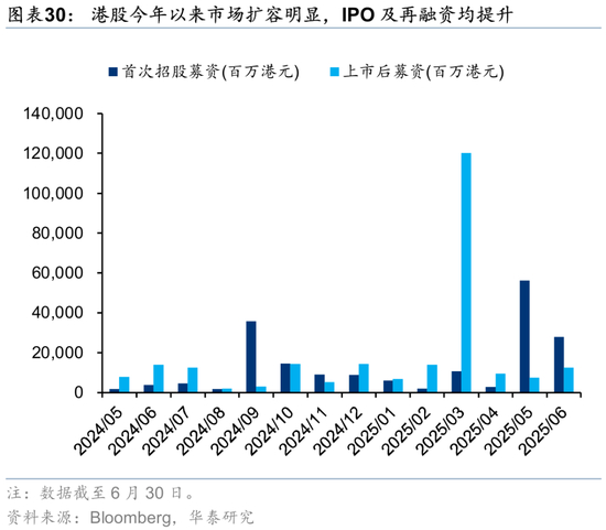 香港市场扩容,不仅是股票,还有债券市场发展。今年以来,港股融资活跃度显著抬升,股票市场扩容明显。2025年截至目前,港股市场IPO融资共1071亿港币,再融资约1738亿港币,均已超出2024年全年水平(880亿、1042亿),全年线性推演来看,IPO及再融资规模或达1900亿、3100亿上方。债券市场方面,人民币国际化和稳定币底层储备要求香港扩大债券市场容量。“债券通周年论坛2025”上,香港证监会行政总裁梁凤仪表示将采取包括扩大南向通参与机构范围,加入券商、保险公司、理财及资产管理公司,优化离岸人民币债券回购业务,允许回购期间债券再质押使用等,进一步为香港债券市场注入新动能。