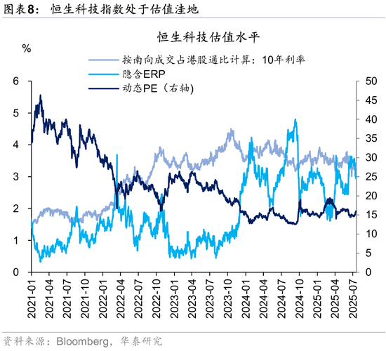 恒生指数短期只需要风险情绪调整就可能突破阻力位,恒生科技修复空间更大。具体细分板块上,我们建议优选景气改善+低估值行业。1)互联网方向,如电商、本地生活等细分板块景气有筑底态势,估值已经较为合理;游戏景气度较高,估值具有性价比;2)煤炭、水泥及周期品景气度或因“反内卷”提速而加速筑底;3)社会服务、纺织服装、航空机场等正处于估值不高+高景气的阶段;4)集中度较高的港股新消费景气度仍高,回调后是更好的介入机会。我们强调关注港股科技板块,其正处于景气修复+估值低位的交集中,且市值占整体港股接近1/3,更适合机构投资者“高切低”布局。