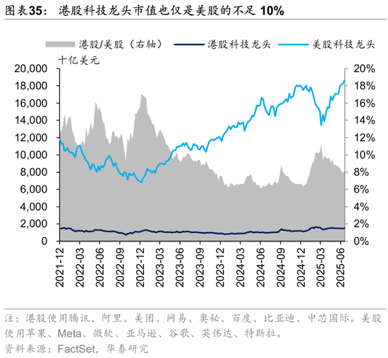 如果说未来全球生产力提升的重要方式是AI技术进步,那目前这个赛场上最有可能获胜的公司更多分布在两个市场,即美股和中国港股。当前全球资本对前者押注更多,大幅超配,但对后者的押注明显不足。自2021年以来,美股科技龙头相对港股科技龙头展现出大规模超额表现表现。即便DeepSeek横空出世后,港股科技龙头市值也仅是美股的不足10%,明显低于2023年初ChatGDP引发全球关注时的17.1%。