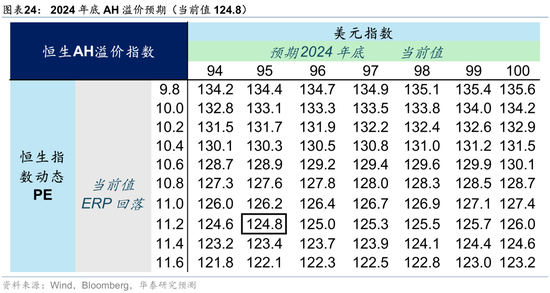 我们估计AH溢价年内有望进一步降至26%甚至更低。影响AH溢价周期性涨跌的两个重要指标分别是美元指数及恒生指数动态PE。前者涵盖了利率、汇率和地缘风险避险情绪等因子,后者主要表征市场是否存在单边压力。若ERP回落带动恒生指数动态PE微升到11倍(当前10.7倍),美元指数进一步回落至96(现在98),AH溢价或回落到26%。