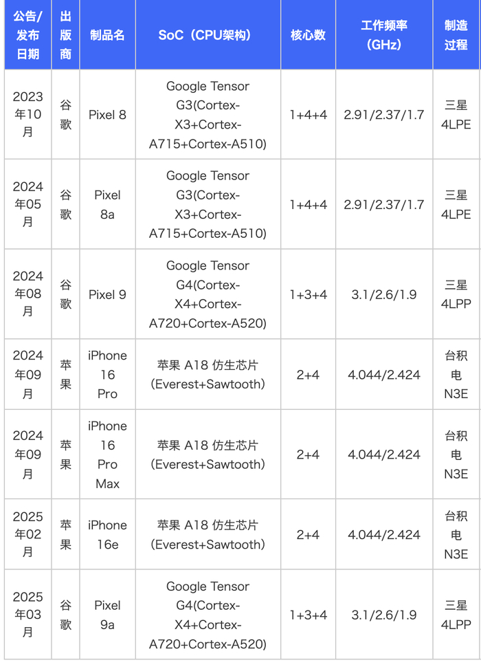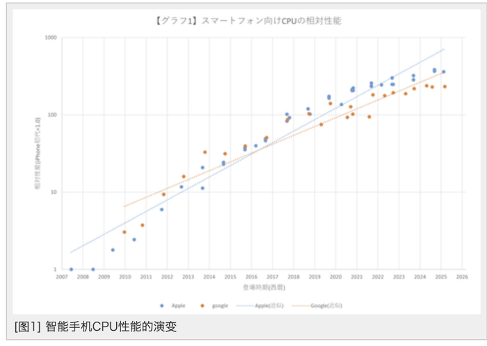 另一方面,对于谷歌而言,2010 年 1 月的 Nexus One 与 2025 年 3 月的 Google Pixel 9a 之间的比率约为 76 倍。年增长率约为 32.2%,略显缓慢。原因之一是,谷歌的 Tensor G4 搭载了 Cortex-X4 核心,但其最高主频仅为 3.1GHz,增长幅度不大,而主要原因被认为是使用了三星的 4LPP。考虑到竞争对手苹果 A18 Bionic 的 Everest Core 最高主频为 4GHz,这被认为是一定程度上抑制性能增长的一个因素。