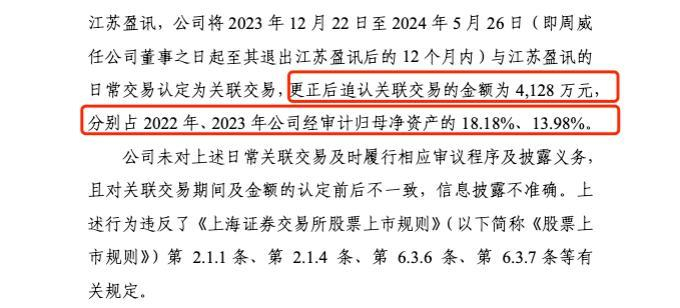 经查,公司现任董事周威曾为江苏盈讯持股80%的大股东和执行董事,于2023年5月退出江苏盈讯,并于2023年12月当选公司董事。根据相关规定,江苏盈讯在此期间为公司关联方,相关交易构成关联交易。