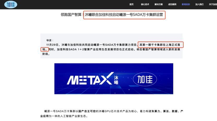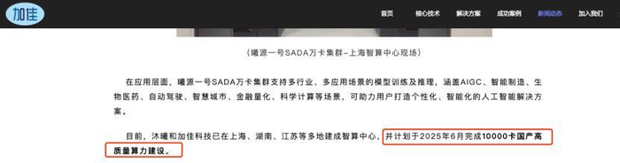 根据加佳科技官网信息,2024年11月底,沐曦股份与加佳科技共同启动了“曦源一号SADA万卡集群算力项目”。该项目第一期千卡集群已在上海正式落地,并于2025年6月完成建设。截至2025年7月,官网未提供进一步更新,尚不清楚项目是否已完全竣工或进入后续阶段。