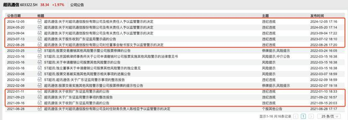超讯通信在过去两年中曾多次被上交所处以监管措施,包括信息披露不准确、未能勤勉尽责、关联交易期间认定不准确未及时披露公司重大事件等。