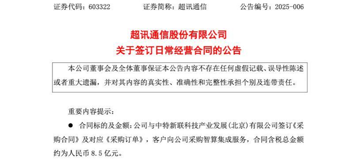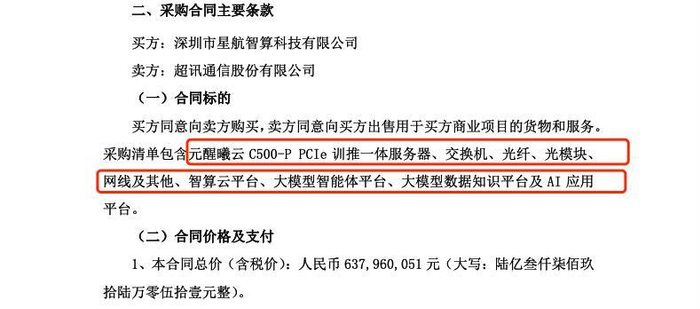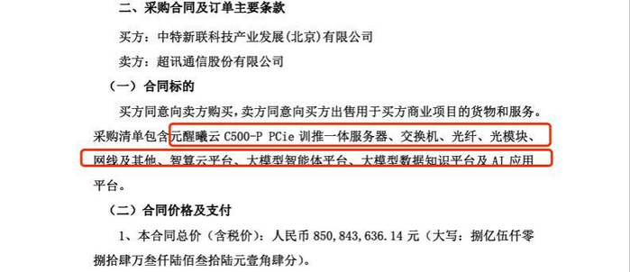 超讯通信与两家公司分别签署总额14.88亿元的订单,采购标的惊人一致,均为“元醒曦云C500-P PCIe训推一体服务器、交换机、光纤、光模块、网线及其他、智算云平台、大模型智能体平台、大模型数据知识平台及AI应用平台”。令人疑惑的是,如何做到两家公司的采购标的完全相同?此外,超讯通信的最终采购方“中特新联”和“星航智算”均非业内知名终端客户,其实际算力需求备受质疑。