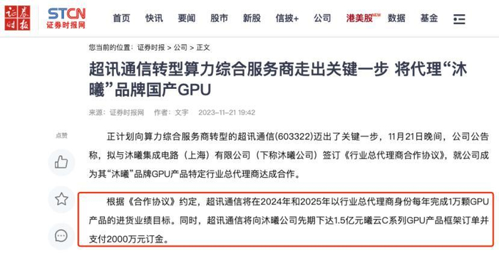 据媒体报道称,超讯通信作为沐曦核股份心代理商,去年已下单1.5亿元曦云C系列GPU产品并支付2000万元订金,持续为沐曦贡献高价值合同。