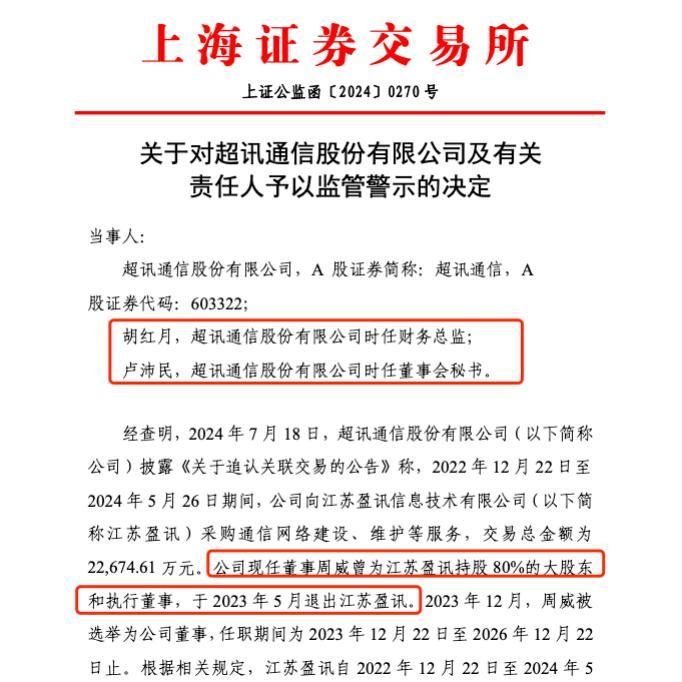 其中,上证公监函〔2024〕0270号显示,2024年7月18日,公司披露《关于追认关联交易的公告》,指出2022年12月22日至2024年5月26日期间,向江苏盈讯信息技术有限公司采购通信网络建设、维护等服务,交易总金额达22,674.61万元。