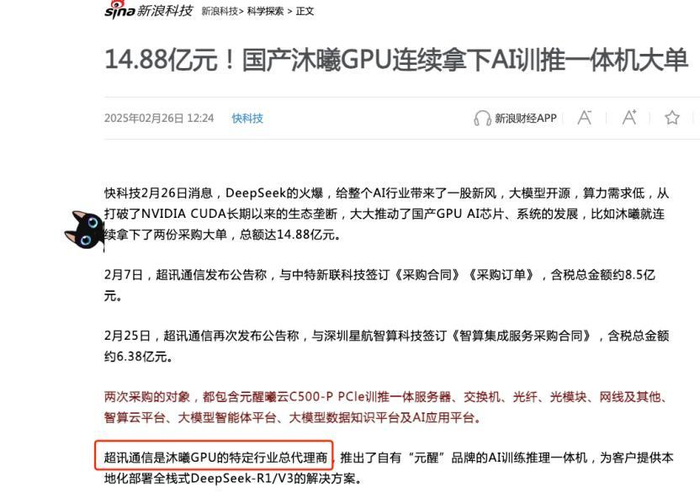 今年2月,A股上市公司超讯通信在一个月内签下两笔总价值14.88亿元的国产GPU产品订单。凭借这一横空出世的大单,超讯通信一跃成为沐曦股份的第一大GPU客户,一个季度就为沐曦股份贡献了1.28亿元营收。