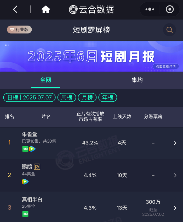 其中,《朱雀堂》开播4小时在腾讯视频站内热度就突破了18000,5天后热度便位列平台热播榜第二、超越同期多部长剧。在猫眼、云合等数据平台,该剧的有效播放量和市占率连续多日断层领先其他短剧,尤其是云合市占率一路从首日的21.3%飙升至第四日的43%以上,不断刷新短剧单日市占率纪录。