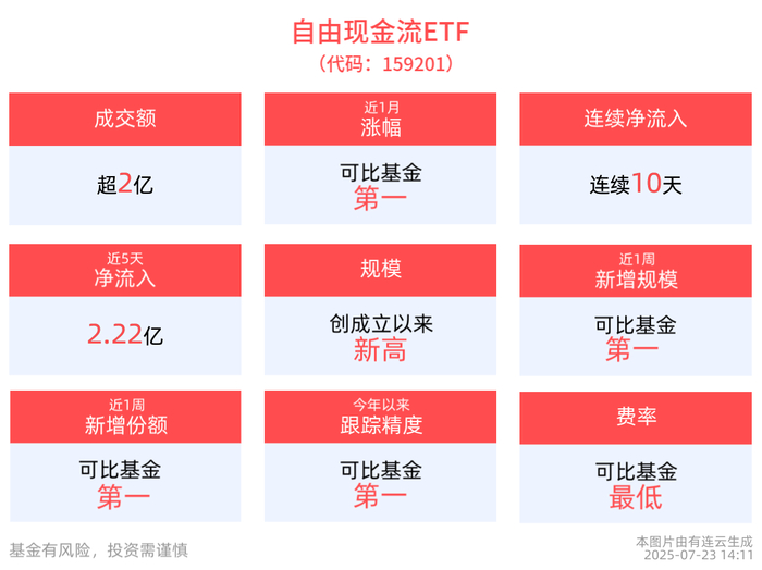 流动性方面,自由现金流ETF盘中换手7.22%,成交2.89亿元。拉长时间看,截至7月22日,自由现金流ETF近1周日均成交3.07亿元,排名可比基金第一。