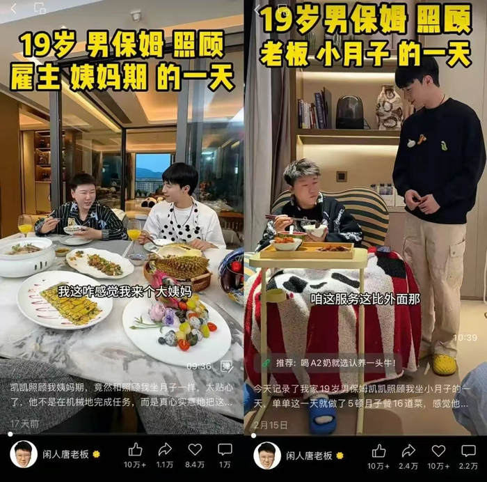 在视频中,作为雇主的 @闲人唐老板 是事业有成、雷厉风行、打扮中性化的单身中年女性,保姆凯凯则是年轻帅气、贴心乖巧的男孩,这样的人设反差一上来就抓住了观众的眼球。