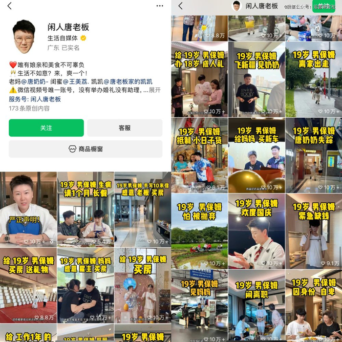 点开 @闲人唐老板 账号主页,最抓人眼球的就是每个视频封面上“19 岁男保姆”的标题。不是大众常见的保姆阿姨,居然是年轻的男保姆,一下子就让人来了兴趣。