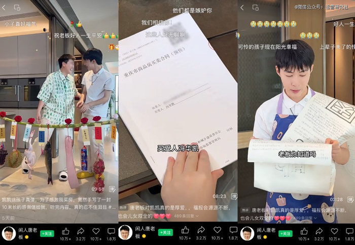 以账号最近发布的《19 岁男保姆手写 10 米信感恩老板买房》的视频为例,@闲人唐老板 一上来就用欢快的语气介绍:“给在我们家工作一年的 19 岁男保姆凯凯买的新房,我这才想起来一直没给他准备新居礼物呢。”拿着葡萄、榴莲、鱼、可乐、甘蔗等礼物的唐老板给凯凯一一介绍,并送上祝福,视频弹幕上也都是点赞和祝福,氛围一篇祥和。