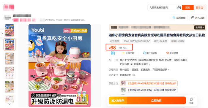 卡手指只是厨房类玩具的风险之一。用电安全同样需要关注。记者在多个电商平台看到,儿童厨房蒸煮过家家玩具种类繁多,不少商家在页面上标注着“仿真”字样,并以“培养孩子动手能力”为卖点,其中插电设计是宣传重点之一。