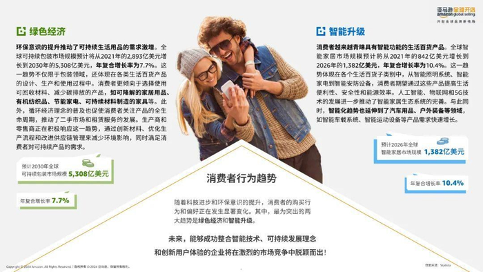 报告指出两大关键趋势:绿色经济和智能升级。绿色经济强调可持续发展,智能升级则关注智能家居、家电等产品的智能化。卖家需关注环保材料和智能技术的应用,以满足消费者对高品质、个性化产品的需求。