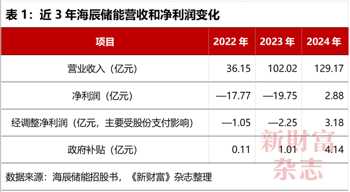 2022—2024年,随着产品出货量放大,海辰储能获得的政府补助金额也由0.11亿元增至4.14亿元。2024年,如果没有政府补助收入,海辰储能经调整净利润仍是亏损0.96亿元(表1)。
