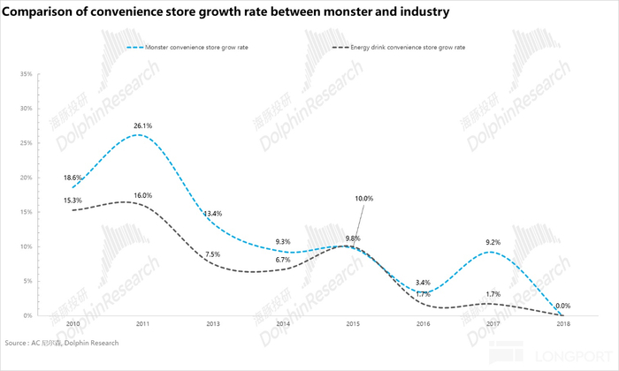 得益于可口可乐渠道资源的加持,从下图可以看到,2010-2018 年间 Monster 在全渠道尤其是便利店的增速持续高于行业平均水平。