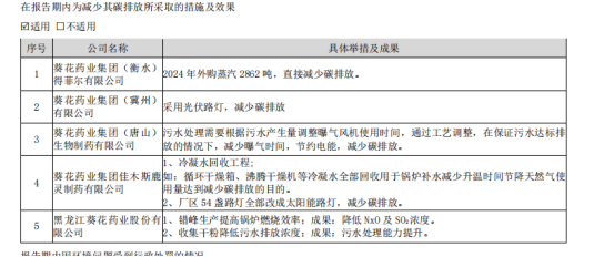 葵花药业表示公司各重点排污子公司严格按照要求开展环境治理工作,并依法缴纳环保税。此外,公司展示了部分子公司的碳减排措施如节能减排、污染物合规排放等,但在成果中公司未提供具体的量化指标和数据支持,例如未披露具体的碳排放减少量、能源节约量或废水处理后的达标率等。