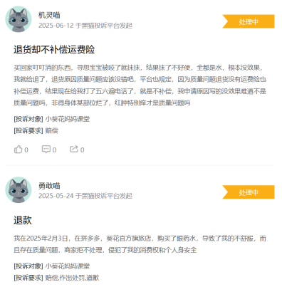 此外,根据黑猫投诉平台,近期消费者针对葵花药业旗下叮叮消系列及眼药水的产品质量表示怀疑,主要集中于疗效不显著、使用体验不佳等问题。与此同时,还有其他消费者投诉公司产品存在异物、虚假宣传以及说明书含糊不清等行为。