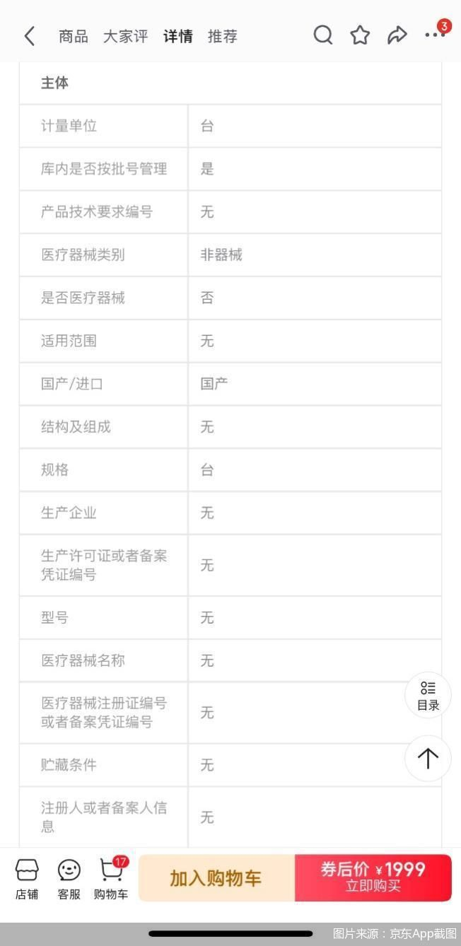更有一些产品的销售渠道“挂羊皮、卖狗肉”,以店铺的医疗器械注册证作为读写台产品的证明,以此来混淆视听。北京商报记者调查发现,在京东App上,包括“财薯大药房旗舰店”等店铺宣传售卖读写台产品时,在图片页展示所谓的医疗器械注册证,乍一看是产品的配套证明,也正因有所谓的医疗器械注册证,相关产品的销售价格远高于同款产品在其他渠道的价格。但在页面的角落里以很微小的字解释称“注册证并不代表产品,仅为展示店铺资质所用”。有业内人士认为,此类行为有误导消费者的嫌疑。