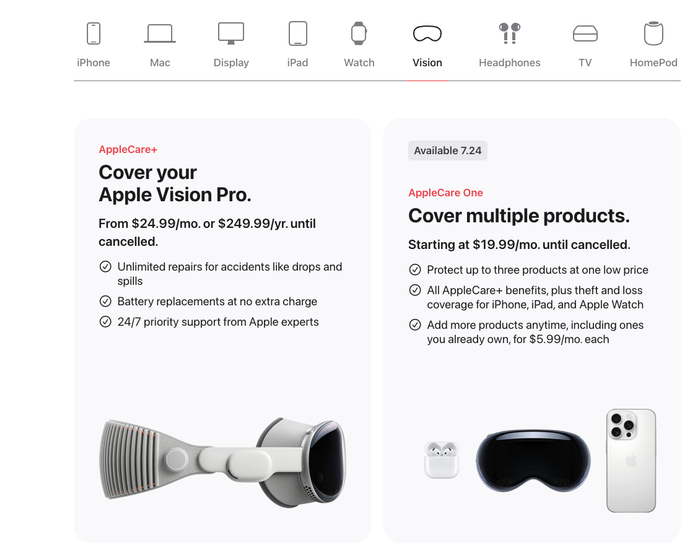 当然,对于数量不多的Vision Pro用户而言,基本可以“无脑购入”AppleCare One,因为这款昂贵头显的全面保修服务定价为24.99美元/月。
