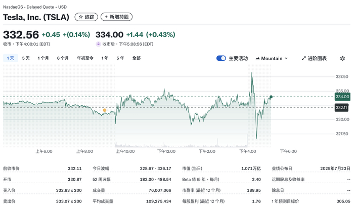 特斯拉周三在纳斯达克交易所的开盘价为330.87美元。截至周三收盘,特斯拉股价上涨0.45美元,报收于332.56美元,涨幅为0.14%。截至发稿,特斯拉股价在盘后交易中增长1.44美元至334美元,涨幅为0.43%。过去52周,特斯拉股价最高为488.54美元,最低为182美元。