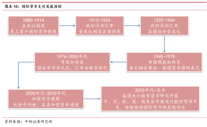2014年,中国人民银行成立专门研究小组开始研究数字货币。2017年1月,央行在深圳正式成立数字货币研究所。2020年,中国人民银行完成了数字人民币的顶层设计等基础工作,同年8月在京津冀、长三角等地区开展数字人民币试点。2020年后,各国央行数字货币研发与试点进程加速。2020年10月,巴哈马在全球第一个推出央行数字货币,开启了央行数字货币实际应用的先河。2021年,日本央行开始分三阶段推进CBDC研发,欧元区正式启动CBDC项目,英国财政部与英国央行就数字货币发布联合声明,CBDC正式进入“开发”阶段。此后,俄罗斯、美国等国家也陆续加快了相关步伐,进一步推动了国际货币体系数字化的发展。