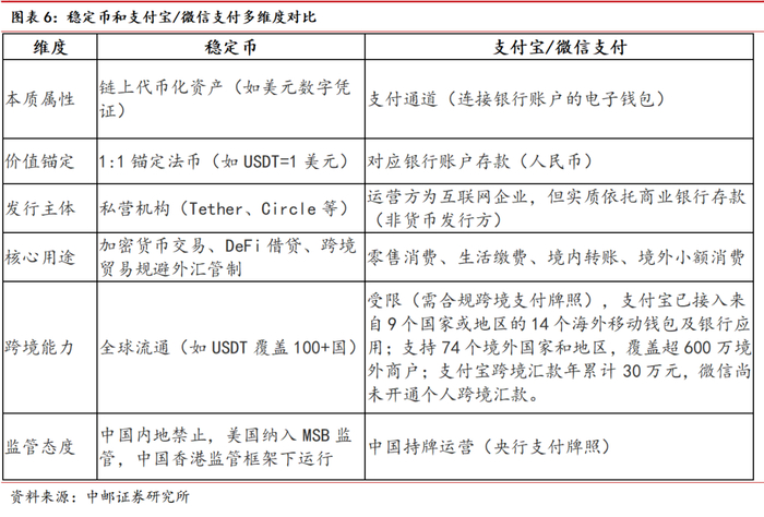 与支付宝、微信支付相比,稳定币获取和兑换需经交易所并支付费用,支付依托区块链可点对点交易但整体仍属中心化体系;而支付宝等通过备付金账户管理,充值无手续费但提现多收费,支付需经清算机构,属中心化模式,且二者在本质属性、监管等方面差异显著。