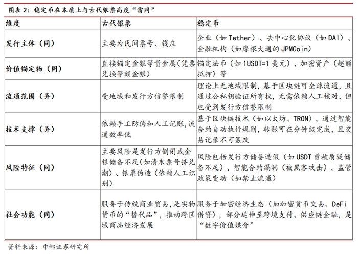 稳定币是锚定法币或实物资产的链上代币化数字凭证,非独立货币,与古代银票有相似性,依托区块链技术提升了流通效率。