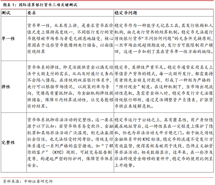 国际清算银行对稳定币定义为一种特殊的加密货币,设计目的旨在维持恒定价值,通常与美元保持1:1挂钩,并由实物资产(如美国国债或黄金)作为支撑,但在单一性、弹性和完整性三个关键测试中仍未达到成为货币体系支柱的要求。