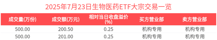 ETF大宗榜 | 生物医药ETF(159859):获大宗交易溢价买入401.50万元,居可比基金第一-20250723