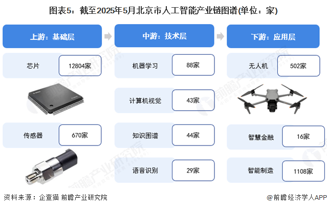 根据企查猫披露的数据显示,截至2025年5月,北京市上游基础层芯片有相关企业12804家,传感器有相关企业670家;中游技术层机器学习有企业88家,计算机视觉有企业43家,知识图谱有企业44家,语音识别有企业44家。下游应用层中无人机企业有502家,智慧金融有16家,智能制造有1108家。