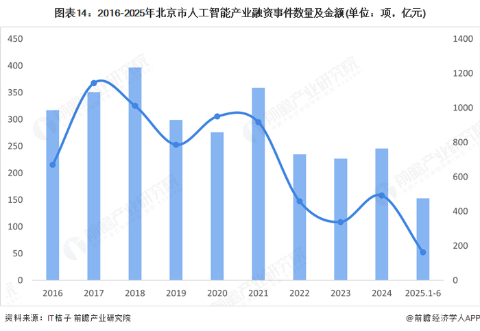 从2016-2025年北京市人工智能行业相关投融资情况来看,该行业融资整体呈现波动趋势,其中2017年北京市人工智能产业融资金额最高,达到1144.98亿元;融资数量呈现波动态势,2018年是北京市人工智能行业的融资数量较高的一年,达397项。2025年1-6月北京市人工智能行业融资数量为153项,融资金额为163.07亿元。