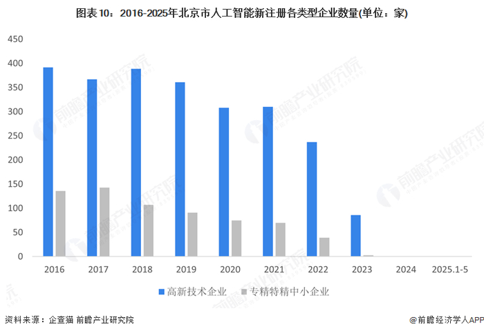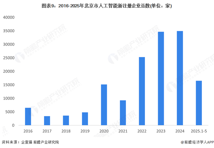 截至2025年5月20日,北京市人工智能共有企业数量156943家,其中高新技术企业4458家,专精特新中小企业1435家。2016-2024年北京市人工智能新注册企业数量呈现波动变化,2024年企业数量达到新峰值为34963家,2025年1-5月新注册企业数量为16524家。