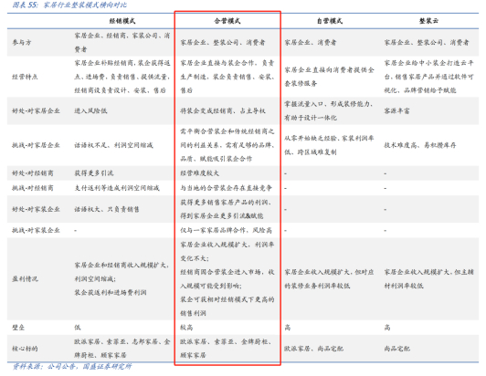 合营模式——家装企业和定制家居企业深度合作,家装企业是定制家居企业的新经销商,定制家居企业是家装企业的独家/少数合作伙伴。该模式经营壁垒较高,一般属于强强联合,家装企业提供设计、施工等服务,定制家居企业掌握流量入口,提供多品类产品,发挥供应链优势。例如欧派家居与当地龙头家装公司合作,推出“欧派整装大家居”;索菲亚与全国性家装龙头创立合资子公司,推出“宜居巢家居超级MALL”;顾家家居和全国性家装公司签约、推出整装渠道独立产品系列“顾家星选”。