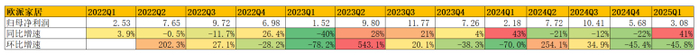 再从2025年一季报数据看,一季度收入仍然呈现下降趋势,主要是因为地产端景气度低迷以及行业竞争加剧影响。欧派家居净利润逆势增长,受益于内部供应链改革、自动化产线与工艺研发升级。