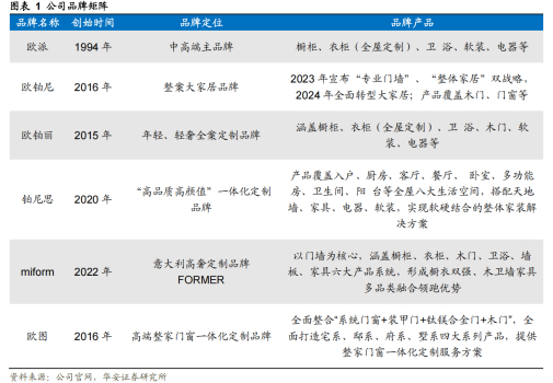 品牌矩阵上,旗下拥有欧派(中高端品牌)、miform(高端品牌)、欧铂丽(年轻时尚品牌)、铂尼思(整装大家居品牌)、欧铂尼(新整家品牌)、欧图(高端整家门窗定制品牌)等。