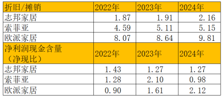 再从现金流角度看,三家公司的经营活动现金流都较为健康,整体净现比都大于1。其中:欧派家居2024年经营活动现金流大幅变好,是因为经营性应付项目大幅增加所致。索菲亚2024年投资损失及应收增加,略拖累经营活动现金流。