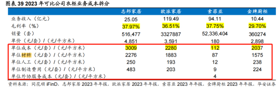 对比志邦家居、索菲亚、金牌橱柜等其他同行业可比公司,橱柜、衣柜的生产成本结构基本一致。