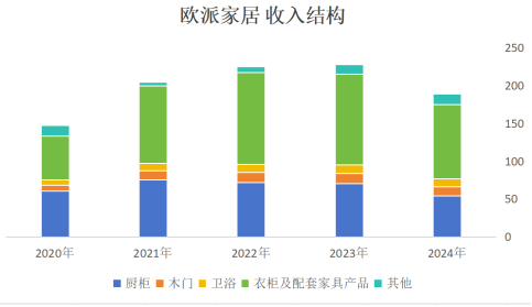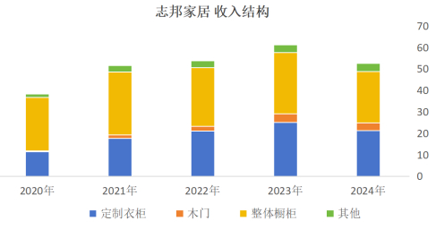 2024年,公司主要业务包括整体橱柜(24亿元,占比46%)、定制衣柜(21亿元,占比40%),还有少部分木门定制(3.7亿元,占比7%)。