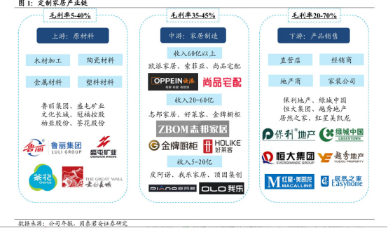 下游——定制家居的销售渠道有直营、经销或工程销售、家装公司,代表公司有红星美凯龙、居然之家、保利地产等。