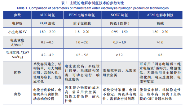 目前主流的电解水制氢技术主要有以下4种:碱性电解水(ALK) 制氢、质子交换膜(PEM)电解水制氢、固体氧化物电解水(SOEC) 制氢、阴离子交换膜(AEM) 电解水制氢[10]。这些电解水制氢技术的参数对比如表1 所示。